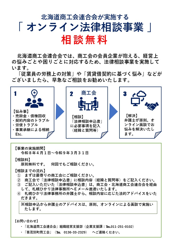 北海道商工会連合会では、商工会の会員企業が抱える経営上の悩みや困りごとに対応するため法律相談事業を実施しております。